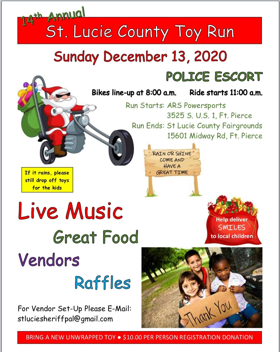 Registration is 2500 or toys of equal or greater value. Motorcycle Toy Run collects 10K toys for kids.